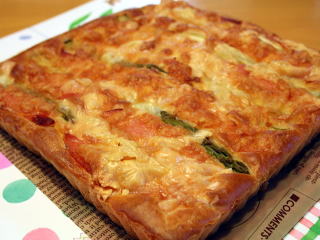 | ピザ風クイックパン アスパラとベーコン、たっぷりのチーズを トッピングしたお手軽クイックパンです。 |