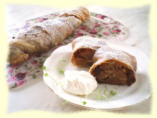 ~ アップルシュトゥルーデル ~ 薄いパリパリとした皮が何枚も折り重なった パイのような生地に、りんごがたっぷり入って います! 焼きたての温かいうちに生クリームやアイスクリーム をたっぷり添えていただきます!、 もちろん、冷めてからでも美味しく召し上がれます。 お一人、1本お土産です。 |