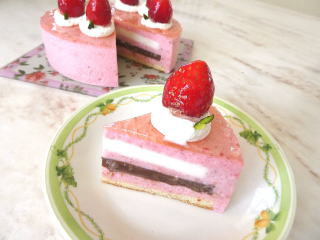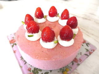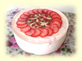 ベリーベリームース 生のいちごをピュレにして作る きれいなピンク色のムースです。 上面には、 生クリームといちごを飾ります |