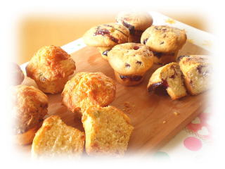 | ~ ベリーのマフィン& ピザ風マフィン ~ ベリーのジャムを入れて焼いたマフィンと ドライトマトやベーコンなどを入れて チーズをかけて焼いた ピザ風マフィンの 2種類のマフィンを作ります! |