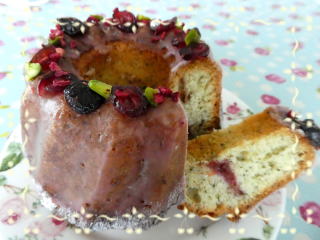 ベリーとアールグレイの クグロフ 香り高いアールグレイを入れた生地に、 ラズベリーとルバーブのコンフィチュールを サンドしたケーキです。 |
