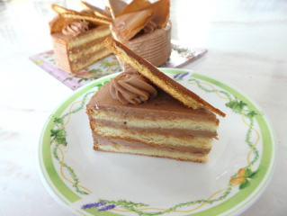 ドボス・トルテ 薄く焼いた生地と、濃厚で口どけの良い チョコレートバタークリームで組み上げ 特徴のある形の仕上げる ウイーンの伝統菓子です |