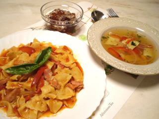 〇 手打ちファルファッレのトマトソース 〇 パプリカとパスタのスープ 〇 紅茶のゼリー 可愛いリボンの形のパスタ、ファルファッレを手打ちで作ります。 ソースは、ベーコンや玉ねぎ、パプリカなどを入れたトマト ソースを作ります。 彩りの良いスープと、さっぱりした紅茶のゼリーも作ります。 |