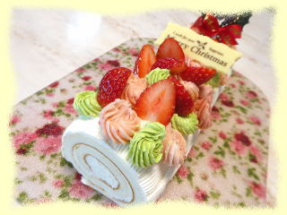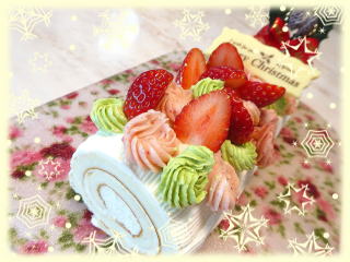 ホワイトクリームの ブッシュドノエル 卵白だけの、白いスポンジに 真っ白なクリームを巻き込み、 上面には、 ラズベリーのクリーム、抹茶のクリーム、 いちごを華やかに飾ります。 |