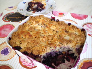 ~ フルーツのコブラー ~ ブルーベリー、ラズベリー、ブラックベリー などのベリー類と、黄桃などのフルーツを、 たっぷり入れた、フルーツコブラーです。 焼き立てを取り分け、 バニラアイスクリームを添えて試食します。 |