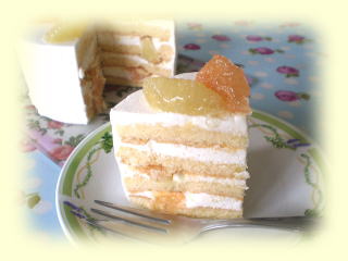 ココアの軽いスポンジを間にはさみ、 洋梨をたくさん入れました。 デコレーションは、 チョコレートソースと金箔で、シンプルに仕上げました。 バレンタインのプレゼントにも。 直径約15cmのケーキを1台作り、 そのままお持ち帰りいただけます。 |
