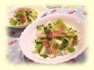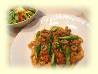 トマトクリームのパスタは、 北海道産の小麦粉でパスタを手作りし、 クリーミーなミートソース風のソースを作り 旬のアスパラなどをトッピングします。 サラダは、シンプルなドレッシングですが、 春らしくカラフルに作ります! ハイビスカスのグラニテは 色合いがとってもキレイなシャーベットです。 |