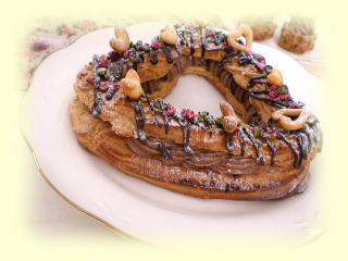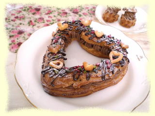 ~ ハートのパリブレスト ~ ハートの形のパリパリのシュー生地の中には チョコレートカスタードクリームがたっぷり! 18cmくらいの大きさで、プレゼントにも ぴったりです。 シュー生地で作った可愛いハートも飾ります。 |