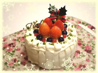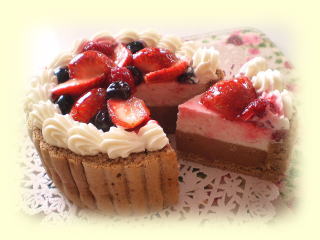 ~ いちごとショコラのシャルロット ~ 直径12cmの可愛いケーキです。 中は、ショコラムースといちごムースの 上にはベリーを飾ります。 |