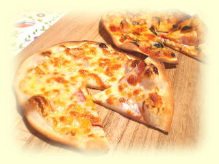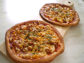 ~ ツナとコーンのピザ~ 全粒粉を入れた香ばしい生地に ツナ、コーン、チーズなどをのせた ピザです。 直径18cm位のピザを、 お一人2枚作ります。 |