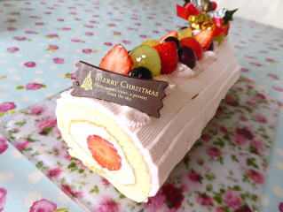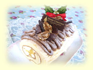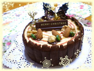 ~ 切り株のクリスマスケーキ ~ フランボワーズジャムを巻いた スポンジのまわりに チョコレートクリームを絞りました。 甘酸っぱいジャムとチョコレートがマッチした 美味しい切り株の上には 木の実や柊、トナカイを飾ります。 |