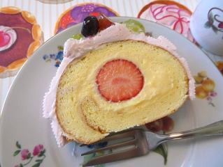 ケーキの周りは、 ほんのりピンク色のクリームをデコレーション。 長さ約14cmのロールケーキを1台作ります。 |