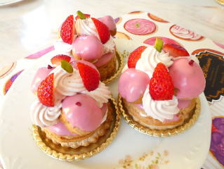 ミニシュークリームの周りは、 ほんのりピンク色のいちごクリームをデコレーション。 食べ応えのある、可愛いサントノレです |