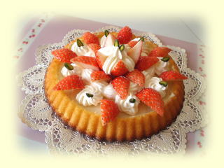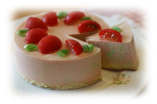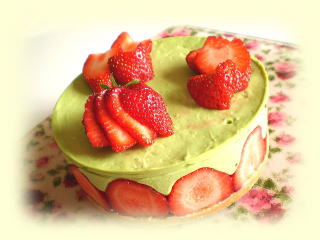 抹茶のレアチーズケーキ 抹茶を入れた、さわやかな レアチーズケーキです。 抹茶の緑とイチゴの赤が きれいなケーキです。 (上の飾りは1例です。) 1台作って、お持ち帰りいただけます。 |
