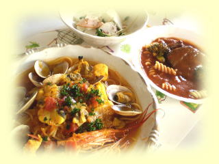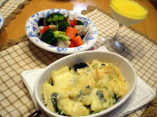 ◆ じゃがいもニョッキのチーズ焼き じゃがいもを練り込んだモチモチのニョッキに たっぷりチーズをかけて、グラタン風に焼きあ げます。 ◆ 温野菜のカレー風味サラダ 季節の野菜をボイル、又は素揚げして カレー風味のドレッシングで和えていただく 温野菜のサラダです。 ◆ フレッシュオレンジのムース オレンジの果汁を絞って、ムースと ゼリーを作り、2層にしていただく、さっぱり したデザートです。 |