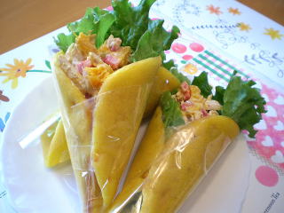 | ~ かぼちゃのラップサンド~ かぼちゃを練り込んだ天然酵母のパンに チキンとかぼちゃ、パプリカの サラダを巻きました。 ほんのり甘くて しっとり美味しい ラップサンドです。 |