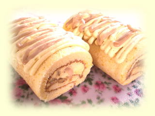 ~ ハニーフロマージュクリームの ロールケーキ ~ ふわふわなスポンジに、 クリームチーズやはちみつで作る クリームを巻き込んだロールケーキです。 同じクリームに、フランボワーズを入れて、 春らしく、桃色にしたクリームを飾ります。 |