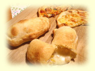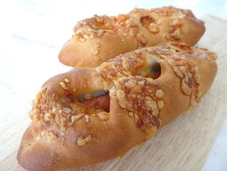 チーズソーセージクッペ ロングウインナーとチーズを入れた ふんわり、さっくりなクッペです。 長さ25cm位のクッペを、 それぞれ2本ずつ作り、 そのままお持ち帰りいただけます。 |