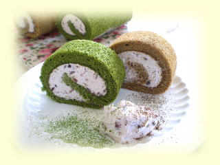 抹茶小豆のロールケーキ 抹茶を入れたスポンジで 北海道産の小豆とフレッシュな生クリームを たっぷり入れて巻きます。 約14㎝の長さのケーキを 1台作って、お持ち帰りいただけます。 |