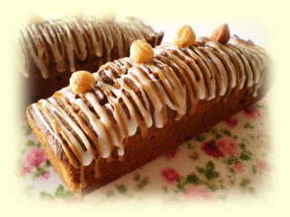 ~ コーヒーショコラケーキ ~ コーヒーの香り豊かなパウンドケーキに、 プチプチとチョコチップも入っています! コーヒーアイシングで飾り、 カリッとしたへーゼルナッツを トッピングします。 |