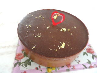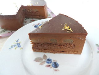 ~ ムース・オ・ショコラ~ ココアの入ったスポンジと、 クーベルチュールチョコレートで作る ショコラムースを層にしたケーキです。 上には、ツヤツヤのグラサージュをかけ、 チョコレートコポと金箔で仕上げます。 |