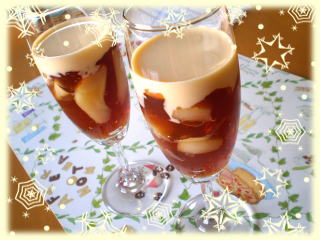 | ~ 洋梨と紅茶のゼリー ~ 良い香りのアールグレイで作ったゼリーと 洋梨を重ね、 とっても美味しいソースを流して 一緒にいただきます。 |