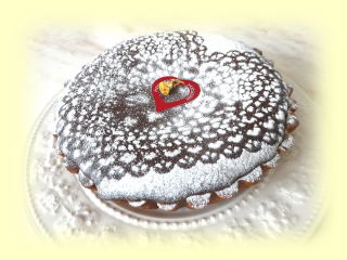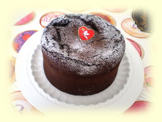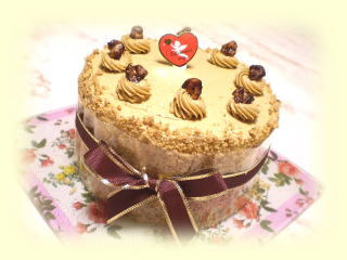 ケーキのまわりには、ウォールナッツパウダーで デコレーションします。 直径約12cmの大きさのケーキを 1台作り、そのままお持ち帰りいただけます バレンタインのプレゼントにもできます。 |