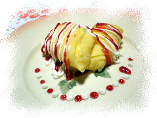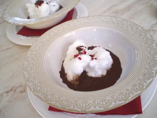 | ~ ウフ・ア・ラ・ネージュ ~ “雪のような卵のデザート”という意味の フランスのお菓子です。 ムースで余った卵白を使って作ります。 ふんわりと柔らかい口当たりのデザートで、 チョコレートのソースと一緒にいただきます。 |