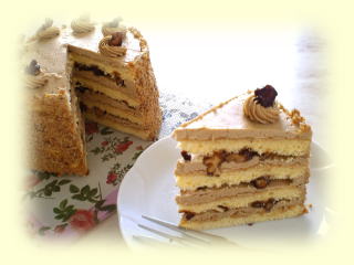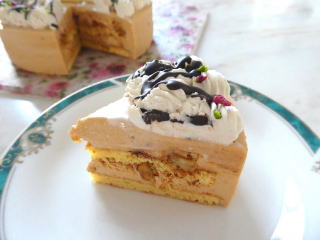 ~ くるみのモカデコケーキ ~ くるみのキャラメリゼと モカバタークリームをはさんだ デコレーションケーキです。 |