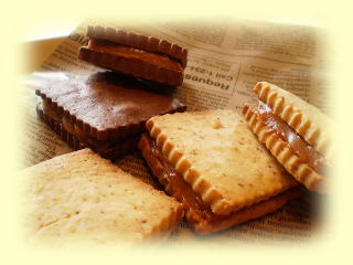 キャラメルサンドクッキー 小麦胚芽を入れた香ばしいクッキーと ココアクッキーに、キャラメルジャムを はさみます。 |