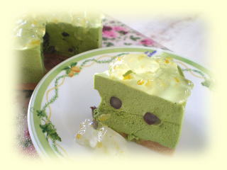 ~ 抹茶のムース ~ ほろ苦い抹茶のムースに、 かのこ大納言をちりばめ、 柚子のゼリーをのせました。 おひとり1台作って そのままお持ち帰りいただけます。 |