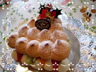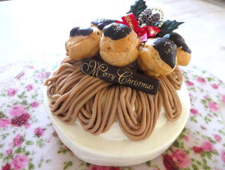 モンブランシューノエル 真っ白いクリームの上に 可愛いミニシュークリームを飾った モンブラン仕立ての クリスマスケーキです。 |
