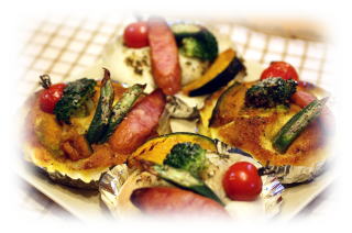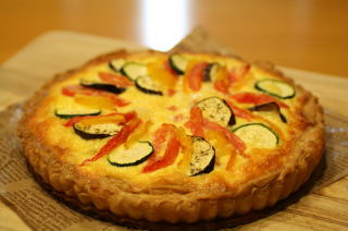 | ~ 夏野菜のキッシュ ~ サクサクなパイのキッシュに、 ズッキーニやナス、パプリカなどの 夏野菜をトッピング。 焼きたてはチーズがとろけます。 出来立て、アツアツを試食します! |