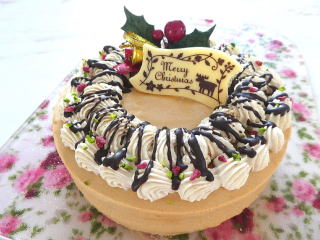ショコラ・リース 今年のクリスマスケーキは、 チョコレートケーキの中にドライフルーツを入れた、 ショコラ・リースです。 焼きあがったチョコレートケーキにチョコソースと アプリコットやいちじくなどを飾ります。 直径約16cmのケーキ1台お持ち帰りいただけます |