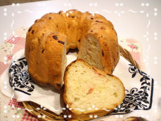 いちごとチョコのカンパーニュ お水の代わりに、 いちごをピューレにして捏ねます。 捏ねた生地はきれいなピンク色! ホワイトチョコレートも入れた 美味しいパンです。 |
