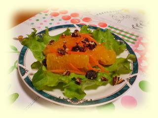 ~ オレンジのサラダデザート~ オレンジの果肉と、にんじんのサラダです。 ドレッシングもオレンジ果汁で作ります。 ピーカンナッツとレーズンがアクセントの さっぱりしたサラダデザートです。 |