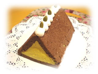 ~ パンプキントルテ ~ ココアスポンジを型に沿わせて 中にかぼちゃのムースを 、 入れました! 三角のかわいいケーキです。 |