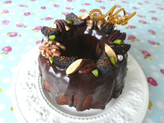 ビターなチョコレートと、 いちじく、ナッツなどを飾り、 リースのようなクグロフに仕立てます。 直径約15cmのクグロフを1台作り、 そのままお持ち帰りいただけます。 |