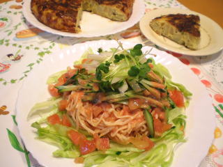 | ☆ サラダスパゲッティは、手作りでパスタを 作り、トマト風味のドレッシングと和える 冷製パスタです。 たっぷりのお野菜と一緒にいただきます! ☆ スペイン風ポテトオムレツは、じゃがいもを たっぷり使った大きなオムレツです。 ふっくらと焼き上げ、カットしていただき ます! ☆ デザートは、桃缶とクリームチーズで作る 、 簡単デザートです。 口どけの良いレアチーズのようです。 良く冷していただきます! |