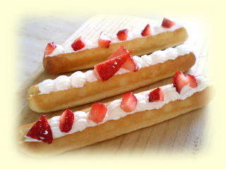 ストロベリースティック スティック形に焼きあがったパンに、 クリームといちごをトッピング。 甘くて美味しい、 菓子パンです。 |