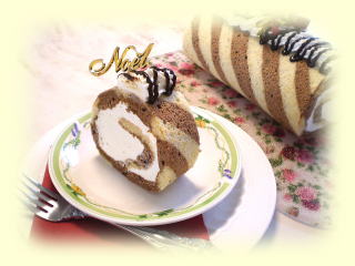 ~ ルーレ・オ・ショコラ ~ ふわふわなココアスポンジに チョコレートクリームと香ばしいくるみを 巻き込んだロールケーキに チョコレートクリームと、チョコソース、 香ばしいナッツ類を飾ります。 |