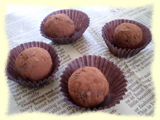 | ~ オレンジのトリュフ ~ チョコレートの中にオレンジピールが入った トリュフです。 スポンジケーキを入れて作るので、 とても簡単に、本格的なトリュフが作れます。 お1人4個、箱に入れて お持ち帰りいただけます。 |