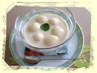 | ~ 豆乳と白ごまの冷たいおしるこ ~ 豆乳と白ゴマで作るおしるこに モチモチやわらかい白玉だんごを浮かべます! さっぱりと、冷たくしていただきます。 |