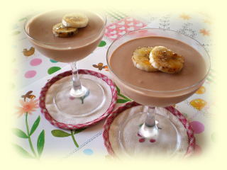 ~ チョコバナナムース ~ クーベルチュールチョコレートと生クリームの 濃厚なチョコレートムースに フレッシュなバナナのピューレを加えた チョコバナナムースです♪ フランベしたバナナを飾り、 甘すぎない美味しいムースです♪ |