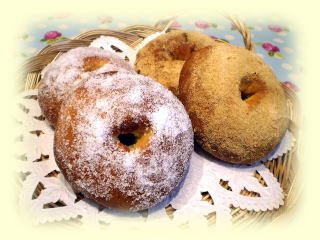 りんごのドーナッツ 旬のりんごを大きく切って軽く煮て、 ドーナッツ生地の中に入れて 丸く整えて揚げます。 揚げたてを試食します。 |